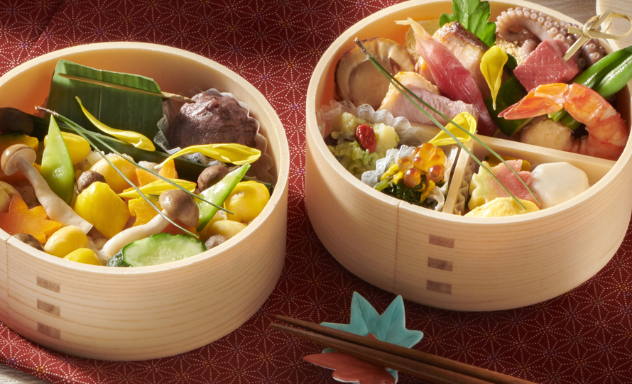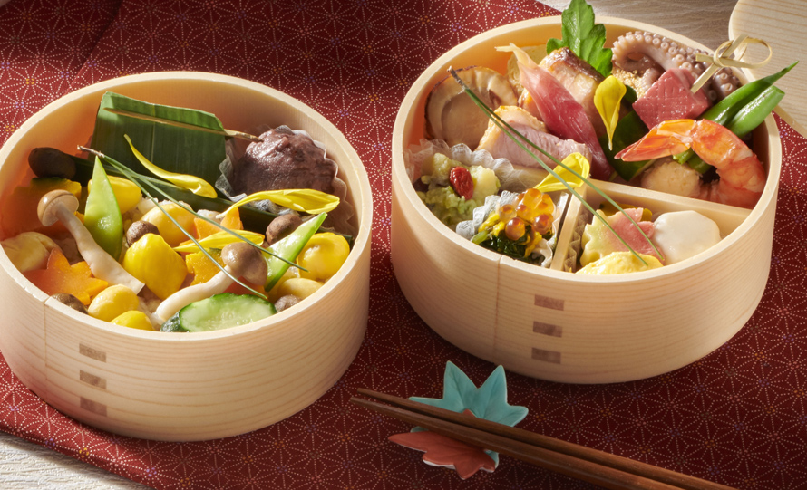 音羽グループ55周年記念商品!やわらかな秋陽に包まれて、秋のごちそう弁当を。選び抜かれた素材を、職人の手で丁寧に仕立て、趣ある「わっぱ」に詰めました。上質なひとときを、秋の陽だまりの中で。